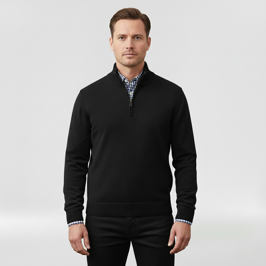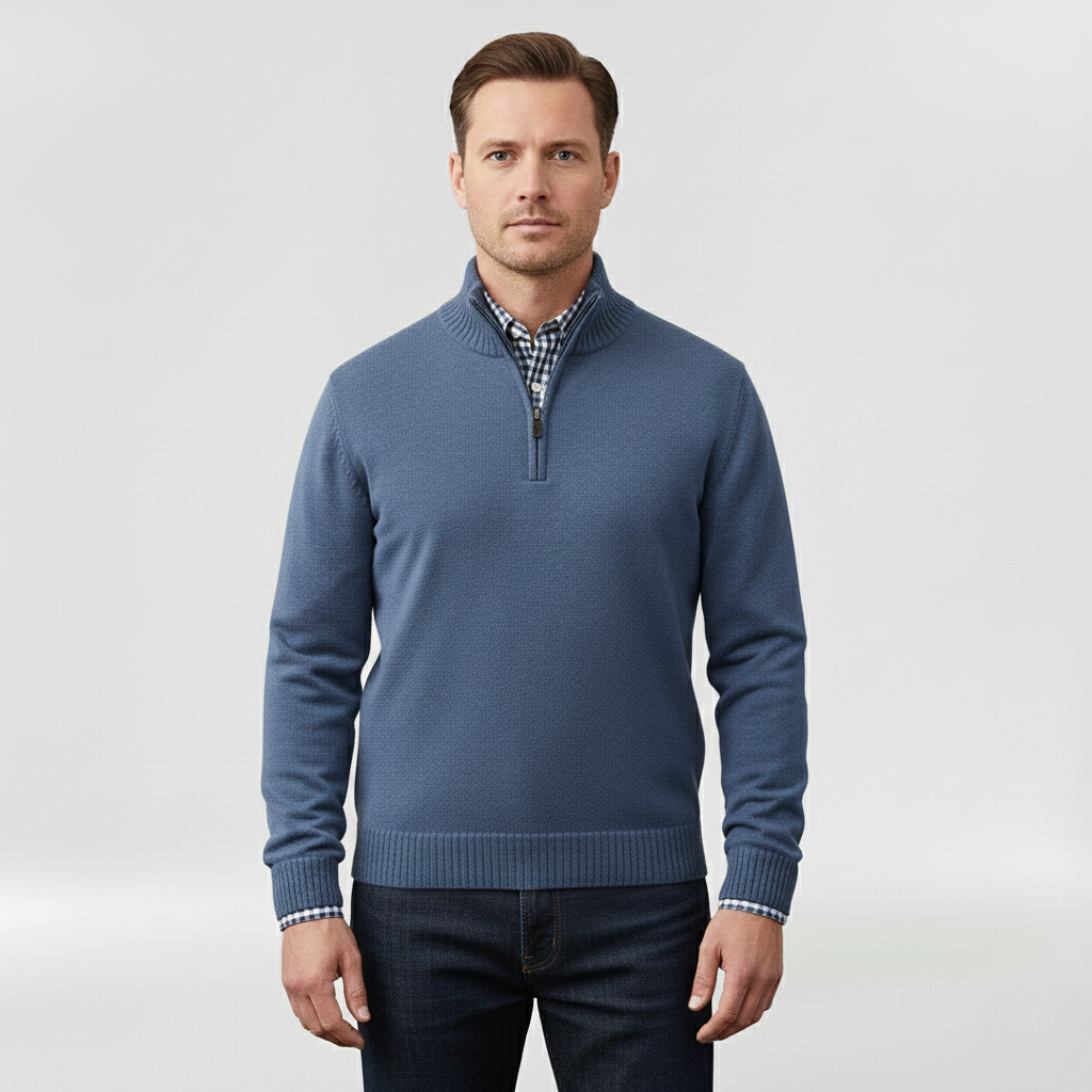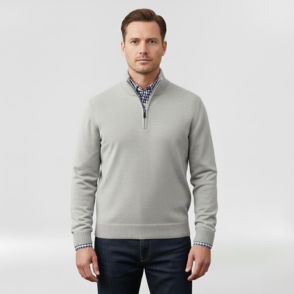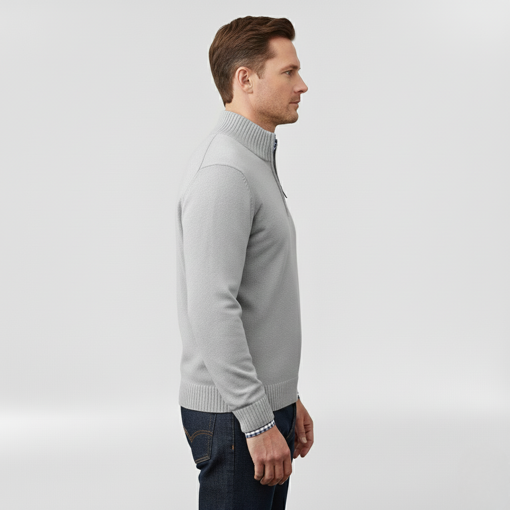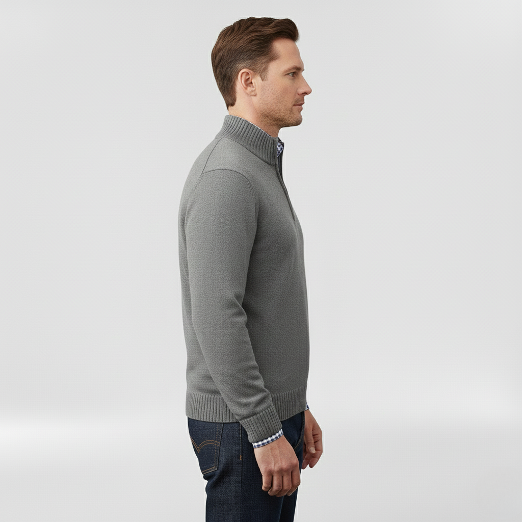 Pánský svetr s polovičním zipem navržený pro každodenní pohodlí a vrstvení.