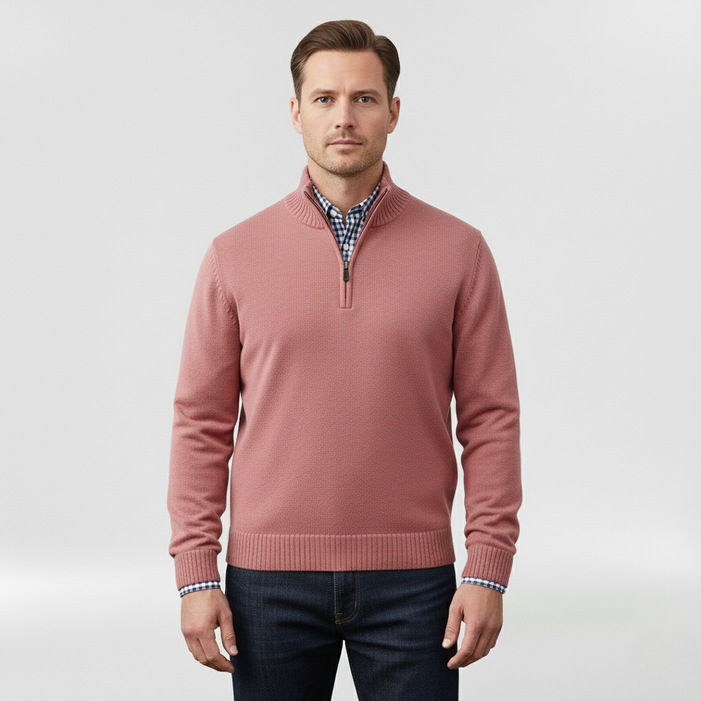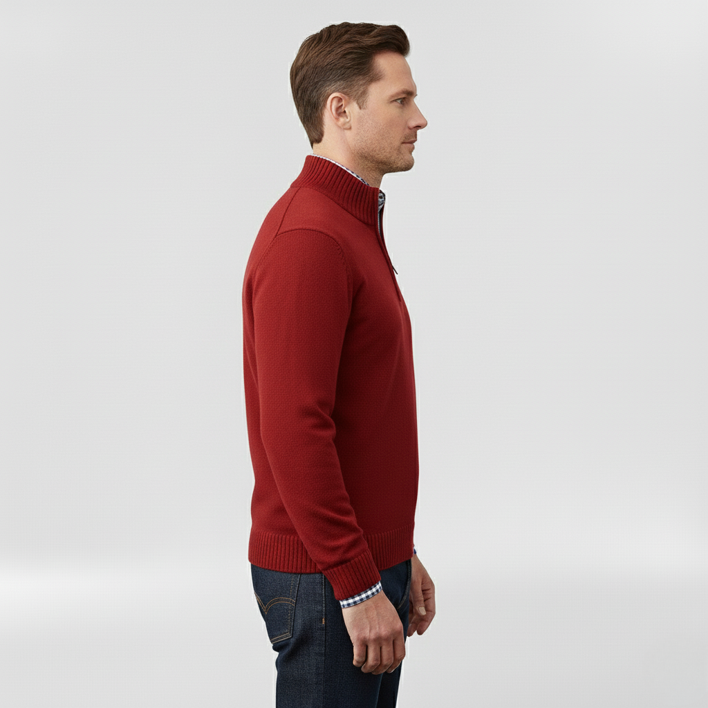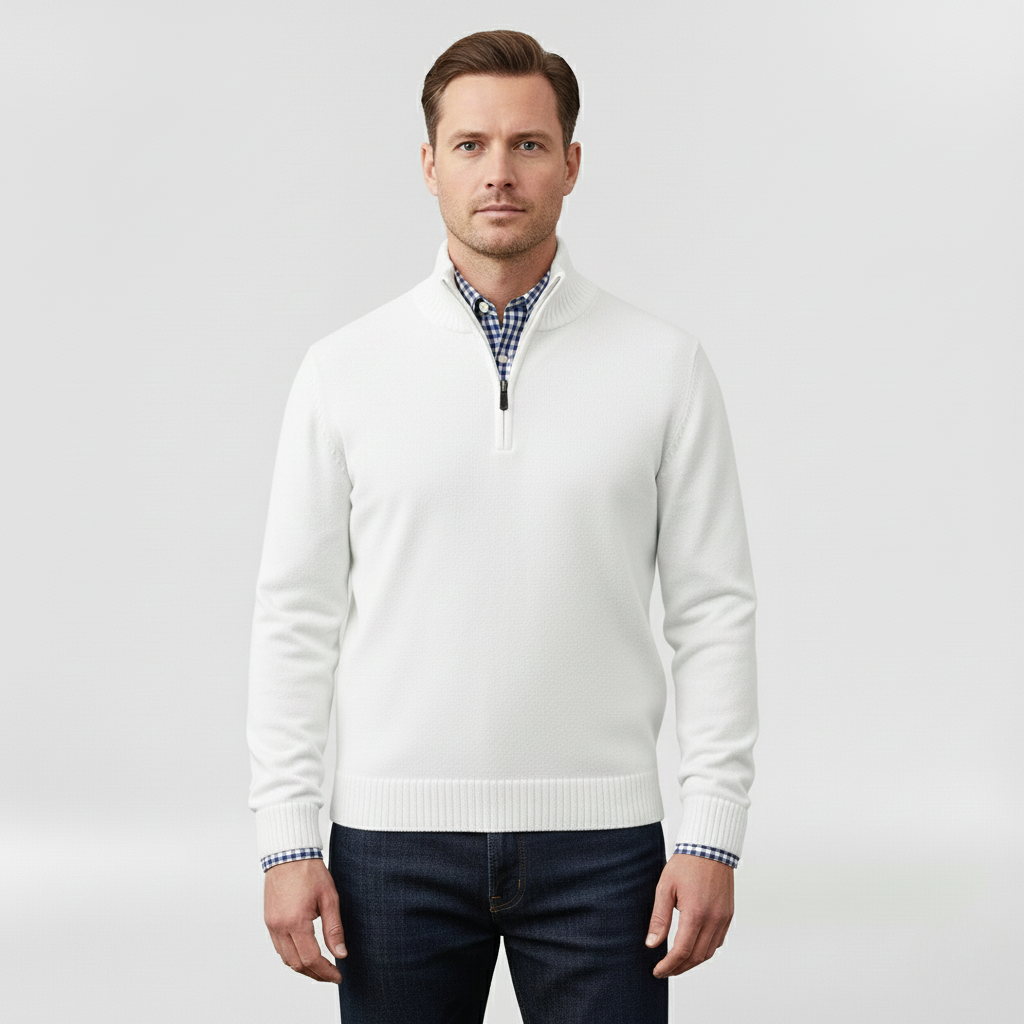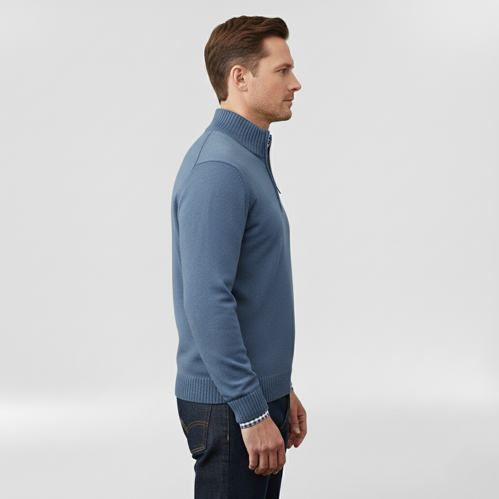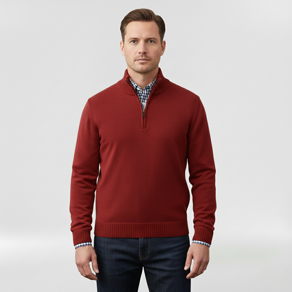 Pánský svetr s polovičním zipem navržený pro každodenní pohodlí a vrstvení.