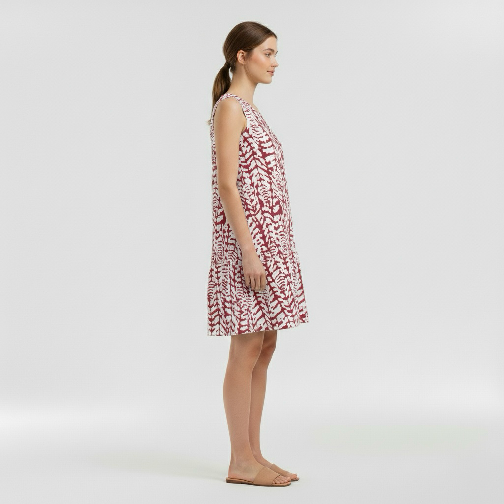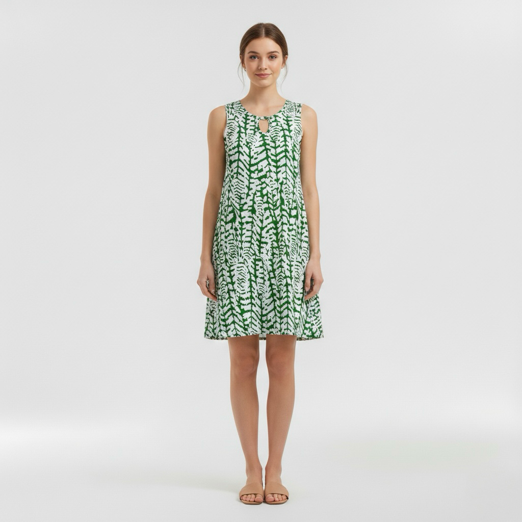 Spolehlivé mini šaty bez rukávů s potiskem, které usnadňují a zpříjemňují oblékání v létě.