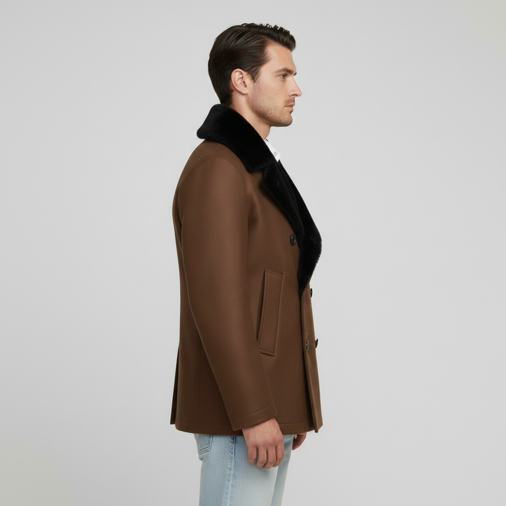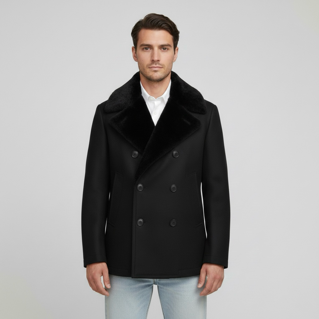 Egy hosszú férfi kabát dupla gombolással és széles gallérral, amelyet arra terveztek, hogy melegen tartson télen.