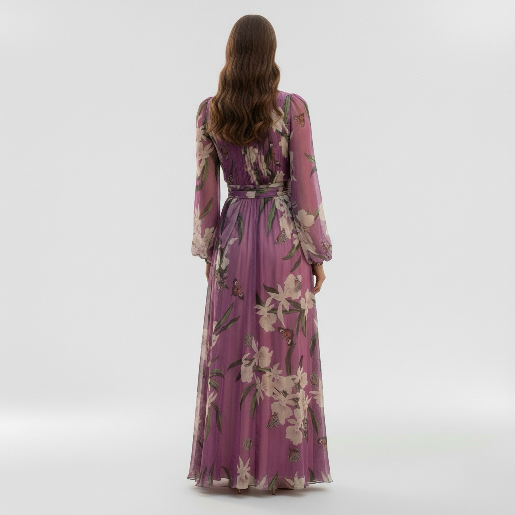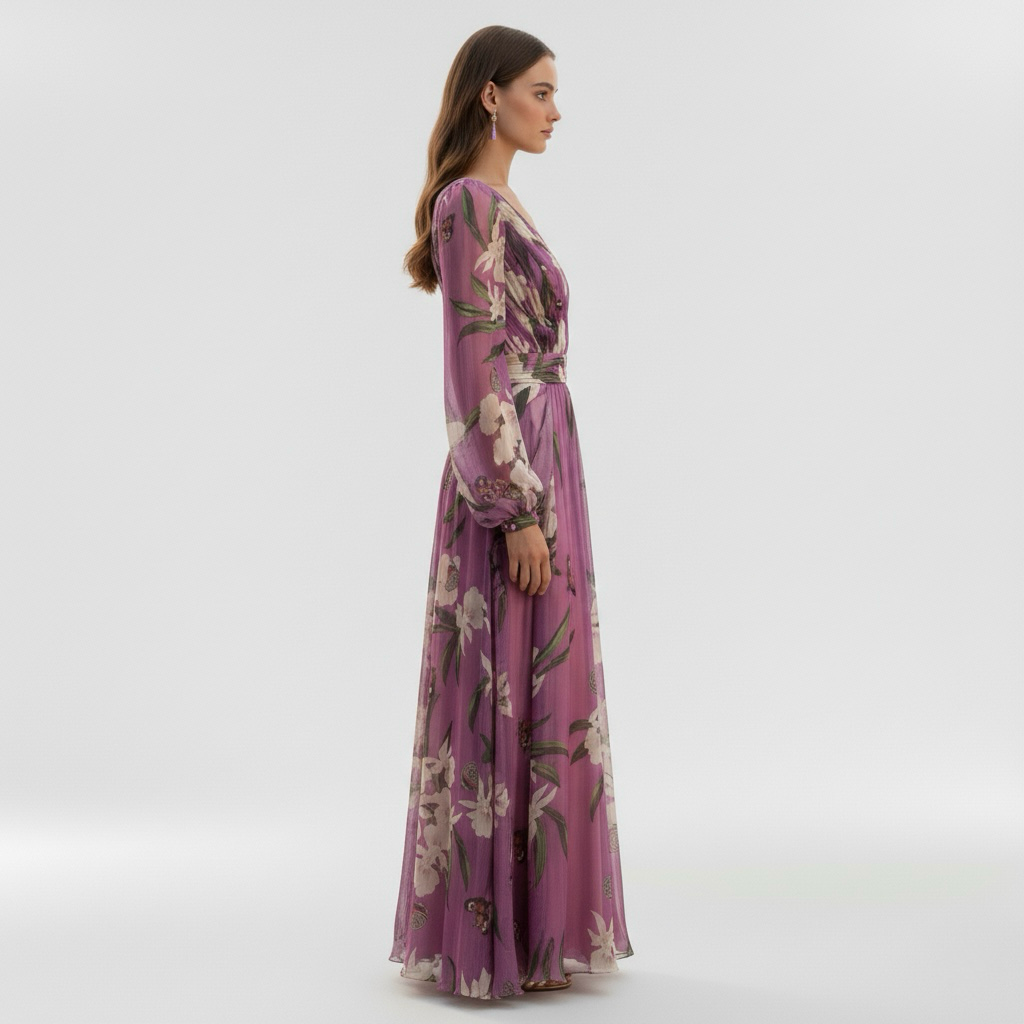 Un abito lungo stampato a maniche lunghe per donna, pensato per eventi, riunioni e occasioni più formali.