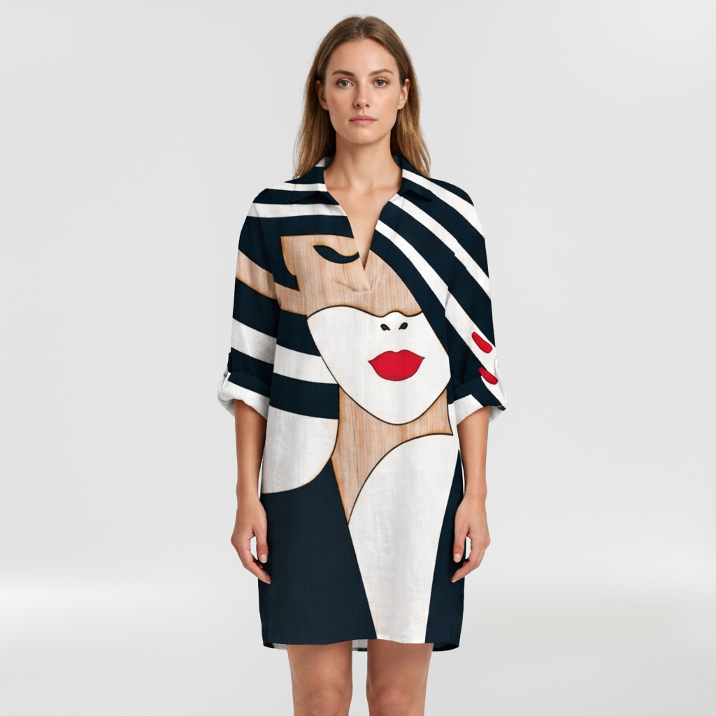 Un vestido camisero estampado con mangas largas para mujer, diseñado para un estilo diario cómodo y versátil.