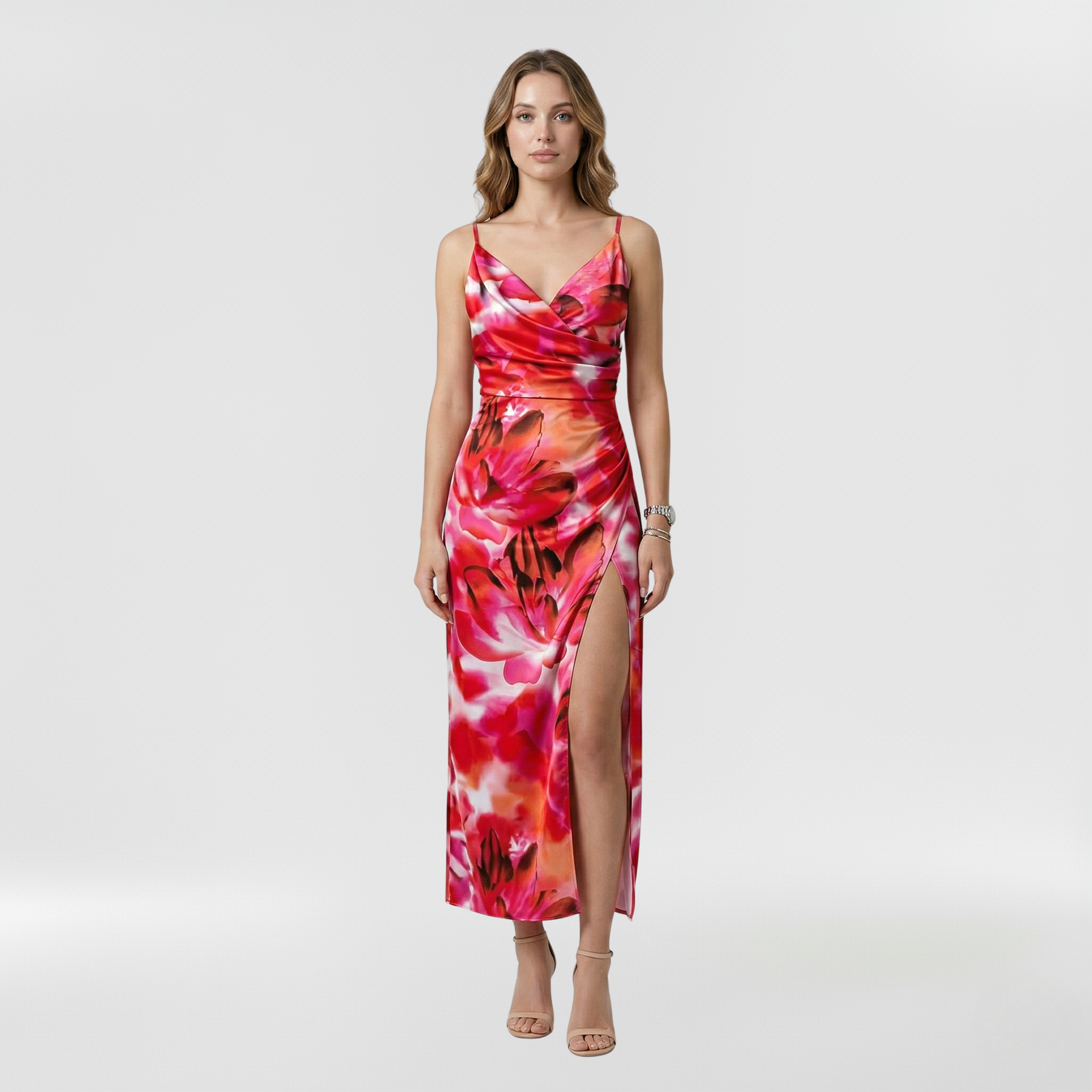 Un vestito maxi con spalline e spacco laterale da donna, progettato per eventi, estate e occasioni speciali.