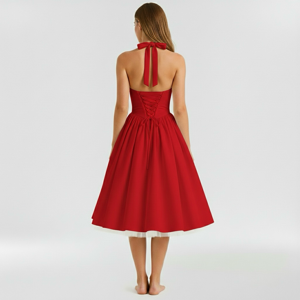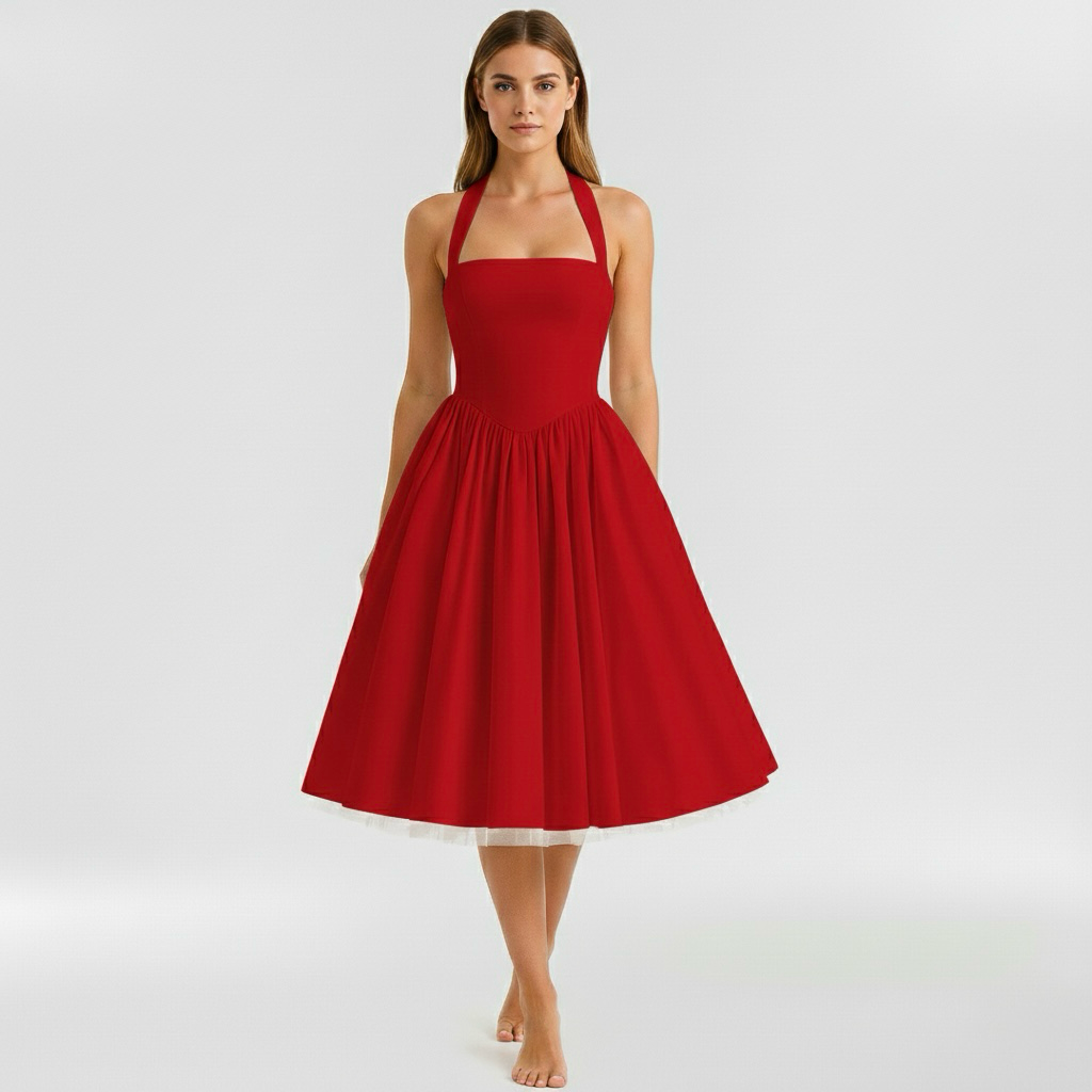 Un abito midi a vita stretta e gonna svasata senza maniche per donna pensato per eventi, feste e occasioni speciali.